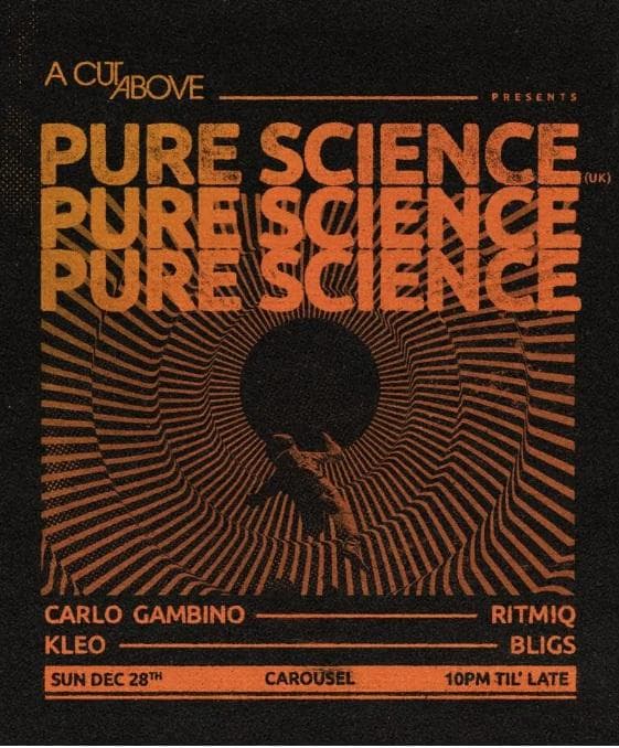 Pure Science has performed regularly as a guest at legendary clubs and parties around the globe for decades including Wiggle, Rage, Pure, Telepathy, The End, Twilo, Zouk, Dungeons, Fuse, UFO club Berlin, The Bomb, Omen Club Frankfurt, Roxy Amsterdam, Sonar Vancouver, Sonna (Montreal), The Edge Sao Paolo, Club UK, Ministry Of Sound, Limelight NYC, Maze USA and Glam Slam LA to name but a few.
