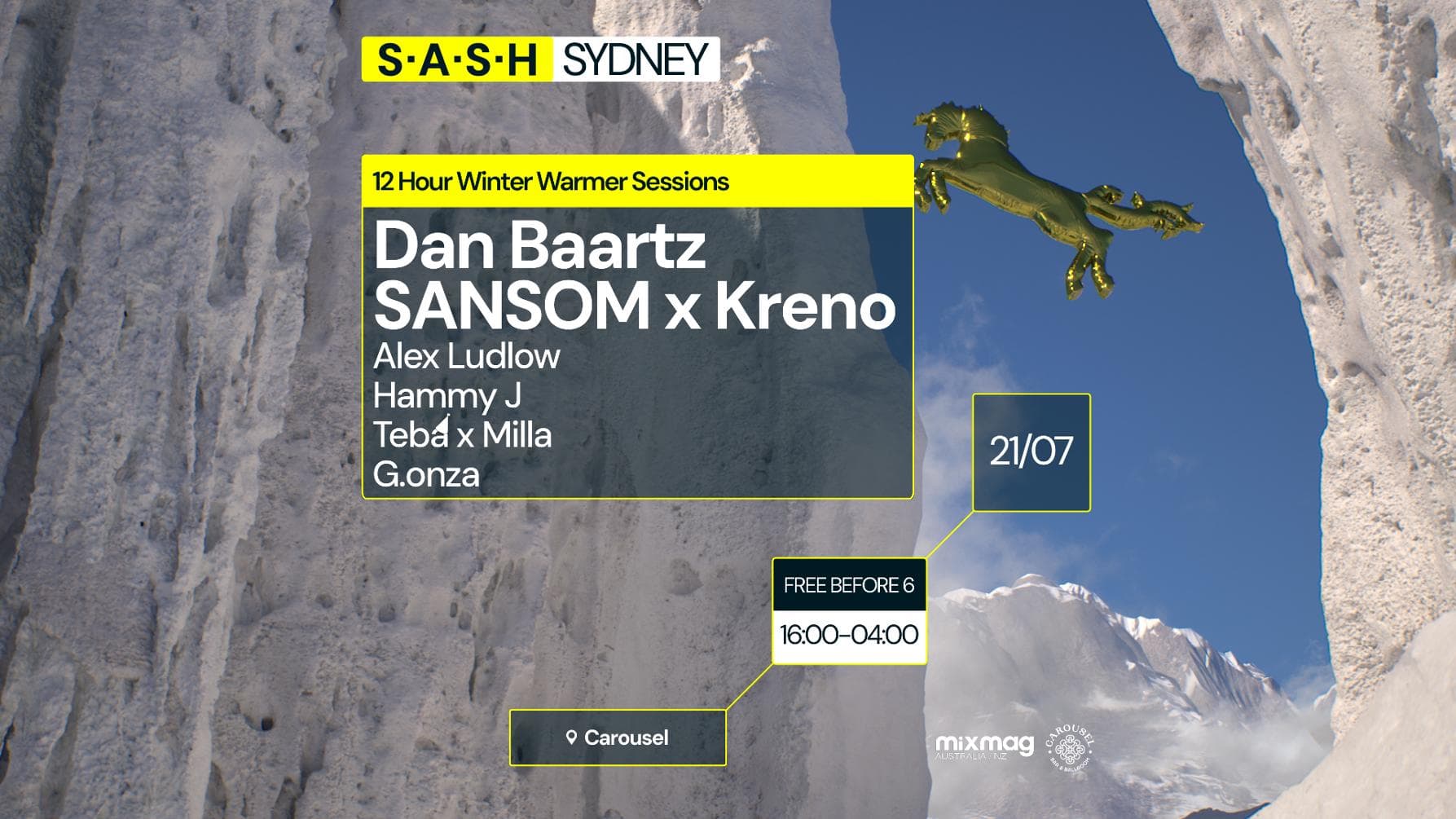 Carousel faces off with none other than Dan Baartz, our superhero selector and beefy beat offender. The man in charge of our haven step’s into the light for an evening of proper, proper tunes. When he isn’t in charge of the red abyss, he dabbles in the construction of musical bliss. Sansom & Kreno start a snowball fight behind the booth, with the two of them taking stage as the clock strikes 12. This devious duo have hot hands around Sydney, as they constantly find themselves on lineups across the city. They're joined by audio aficionado: Alex Ludlow, another prime figure and staple to the music industry we’ve got here. Hammy J stretches his hammie as he runs back to the Carousel booth. He’s dressed and most certainly impressed in recent times, so catch him for a session or pure delight. Tenacious Teba goes for a birthday b2b with Milla, while G.onza steps into the red abyss to join in on the fun.